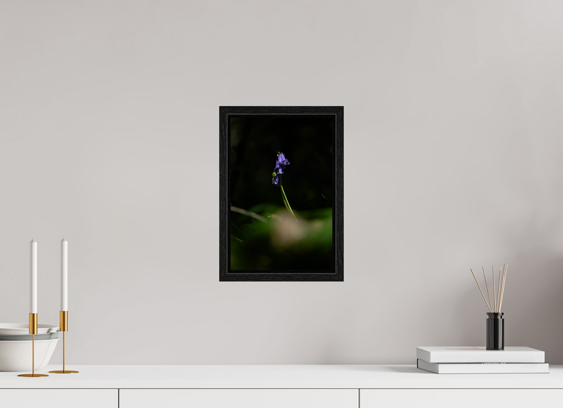 A solitary bluebell leans gracefully into a shaft of light, emerging from the darkness like a whispered secret of the forest. The contrast between the vivid bloom and the deep shadows captures the delicate drama of nature’s quiet moments.