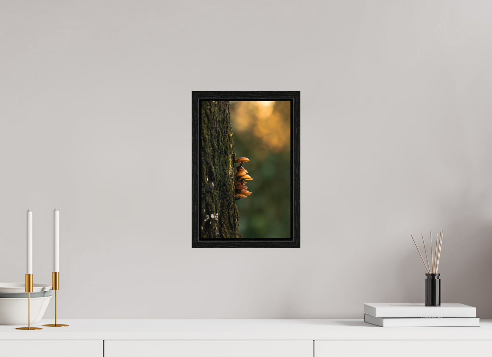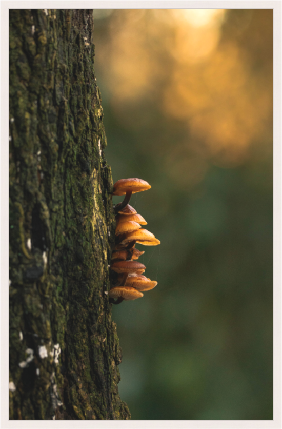 This photograph captures a cluster of golden-hued mushrooms growing on the textured bark of a tree. The warm, soft lighting in the background creates a dreamy, autumnal atmosphere, highlighting the delicate details of the fungi. The contrast between the rough tree bark and the smooth, organic forms of the mushrooms adds depth and intrigue, showcasing nature's quiet beauty and resilience.